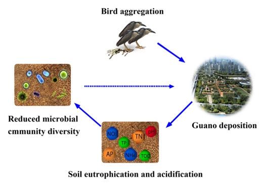 研究生情况:王斐,2018级生物学专业硕士研究生,攻读硕士学位期间获得国家奖学金,连续三年被评为“优秀党员”。硕士毕业论文题目为“鸟类聚集对斑块化森林土壤性质和土壤微生物的影响”,论文采用16SrDNA和ITS高通量测序及多元统计分析方法研究了鸟类聚集对广州市两处斑块化森林的土壤化学性质、土壤细菌和真菌多样性和功能的影响,发现鸟类聚集所沉积的鸟粪可使土壤酸化和富营养化,从而导致亚硝酸盐氧化型细菌、硝酸盐还原型细菌、纤维素分解细菌以及腐生型真菌显著降低,进而影响土壤和植物间的营养循环(图2)。论文为可持续的城市森林设计规划提供了重要的参考依据。论文成果已发表于Science of the Total Environment。