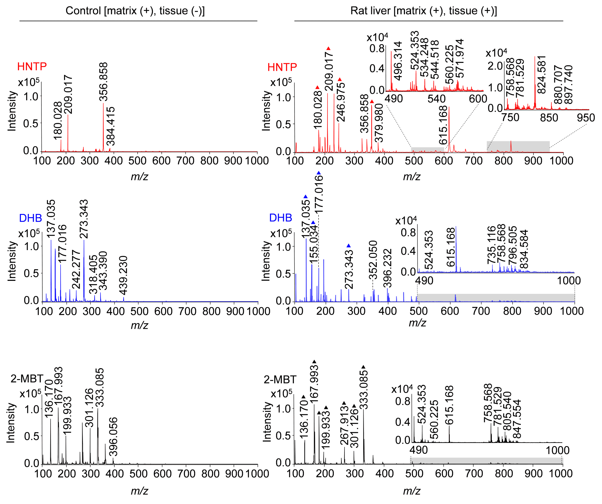 图2. HNTP、DHB和2-MBT三种基质在正离子模式下的基质相关离子信号(左)和大鼠肝组织平行切片代谢物的MALDI-TOF质谱图(右)。三角形表示相对应的基质相关离子信号。