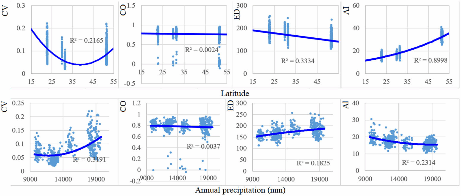 图3 光谱物种多样性、邻体物种关系与纬度和年度降水量关系