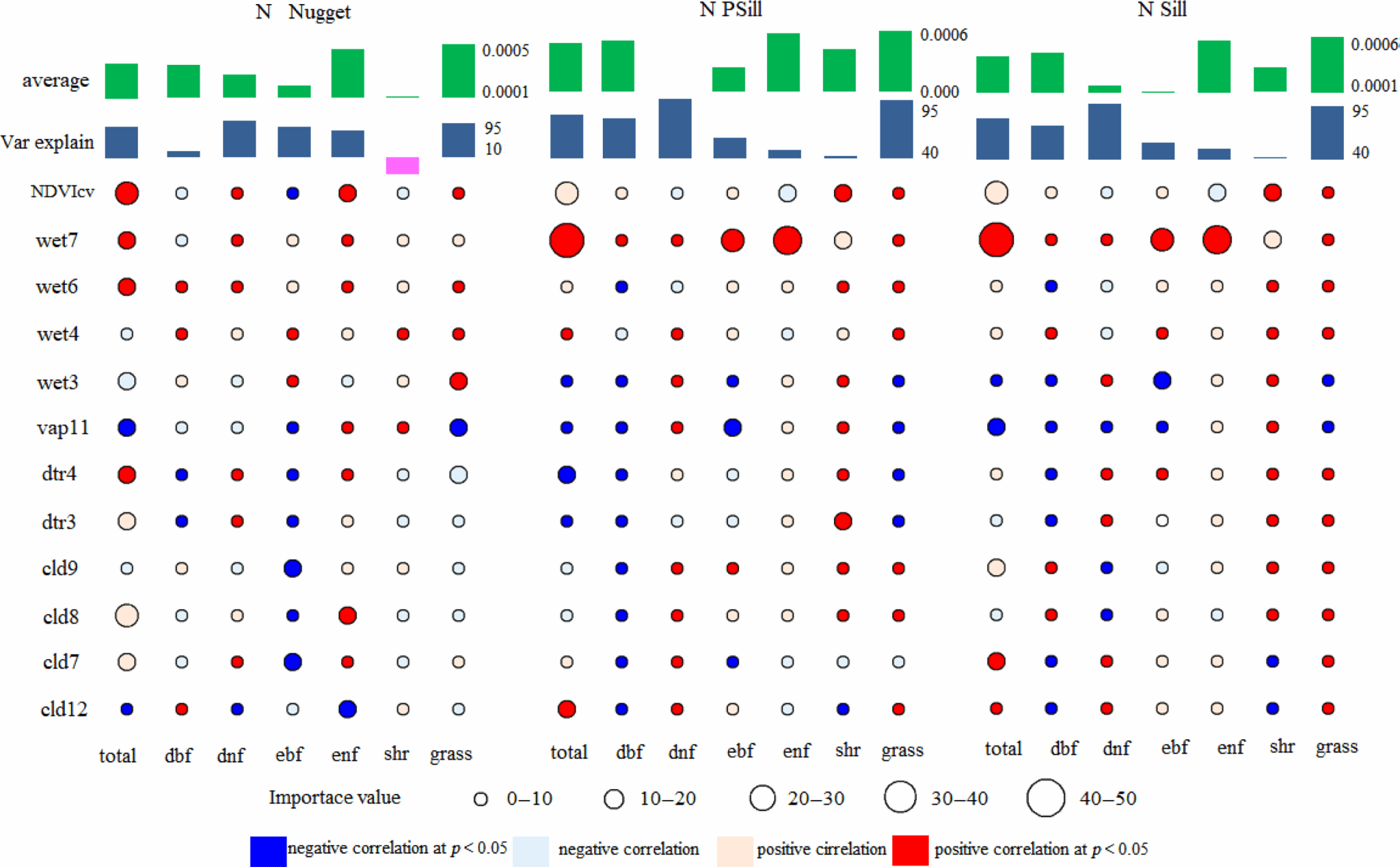 采用空间自相关块金效应分析量化了植物多样性变化的随机效应的贡献。使用卫星遥感影像数据提取出的归一化植被指数,计算了全球49个自然保护区中147个样方1990年、2000年、2010年和2020年的空间自相关性参数(图1),使用随机森林模型确定10个年度和120个月度气候变量中的关键驱动因素。研究结果表明,全球不同植被类型的植物群落的空间自相关性模式存在差异:草原和常绿针叶林的空间自相关性最高,主要受年度能量指标的影响;赤道附近的热带常绿雨林和北极圈附近的针叶林的空间自相关性最低。从1990年到2020年,Nugget、PSill和Sill分别下降了92.36%、58.36%和60.61%,表明生物同质性趋势显著。月度气候变量比年度气候变量更好地解释了空间自相关性的变化(图2)。该研究的创新点在于,通过对不同植被类型的植物群落的研究,揭示了全球植物多样性的空间自相关性模式的差异性和变化趋势,发现了气候变化是影响植物群落空间自相关性的主要因素之一。研究结果对深入了解全球植物多样性的演变和应对气候变化具有重要的意义。