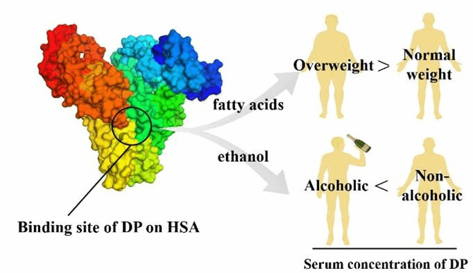 此外,该研究还比较了超重与正常体重人群、饮酒与非饮酒人群血清中DP浓度的差异,发现超重人群血清中的DP浓度高于正常体重人群,而饮酒人群血清中的DP浓度低于非饮酒人群。作者通过实验验证了脂肪酸的存在会升高DP与HSA的亲和力,而乙醇会降低DP与HSA的亲和力。从微观角度推测,脂肪酸与HSA结合会扩大DP在HSA上的结合位点,而乙醇则会占据DP在HSA上的结合位点。