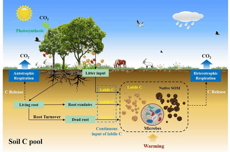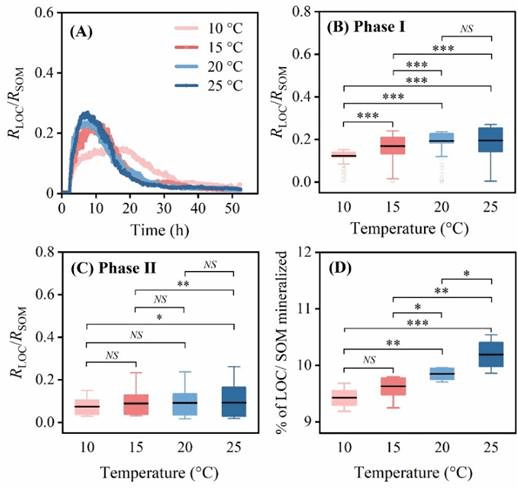 研究结果表明,微生物对易分解有机碳输入的反应是迅速的,易分解有机碳的添加促进了土壤有机质的分解,而温度的升高增强了微生物对易分解有机碳添加的反应强度。随着温度的升高,微生物利用易分解有机碳和土壤有机质的呼吸比例增加,更多的易分解有机碳被用于呼吸作用(图2)。此外,易分解碳输入增加了土壤有机质分解的温度敏感性,但这种影响随着易分解有机碳的消耗而逐渐减少。总之,本研究强调了温度和易分解有机碳输入对碳循环具有重要影响。