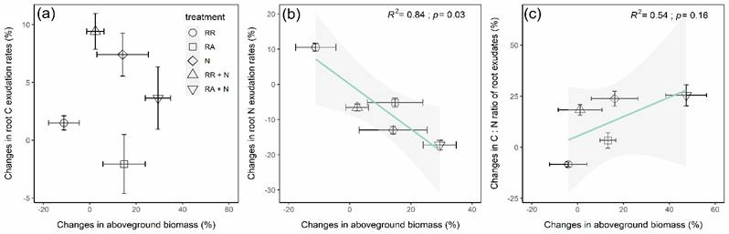 呼伦湖保护区草原生态试验站为基地,以该地区优势物种克氏针茅(Stipa krylovii)和多根葱(Allium polyrhizum)为研究对象,重点探讨2个问题:植物根系分泌物的C、N分泌速率以及C : N化学计量比如何响应土壤水和氮供应的改变?根系分泌物分泌速率的响应是否与植物生长的变化密切相关?研究结果表明,根系分泌物中N分泌速率的变化对降雨和氮处理的反应比C分泌速率的变化更敏感。加N及其与降雨处理的交互作用使N分泌速率下降了4–18%,C:N比率增加了8–27%。在降雨量减少时,模式相反。此外,根部C分泌速率的变化对降雨和氮处理的反应与植物生物量的变化没有关系,而根系N分泌速率随着植物生物量的增加而减少,导致根系分泌物C:N的总体增加(图3)。总体来说,该研究结果揭示了根系分泌物C:N比率在应对资源变化过程中的可塑性,对于理解植物–土壤–微生物的相互作用和环境变化下的生态系统功能有重要意义。