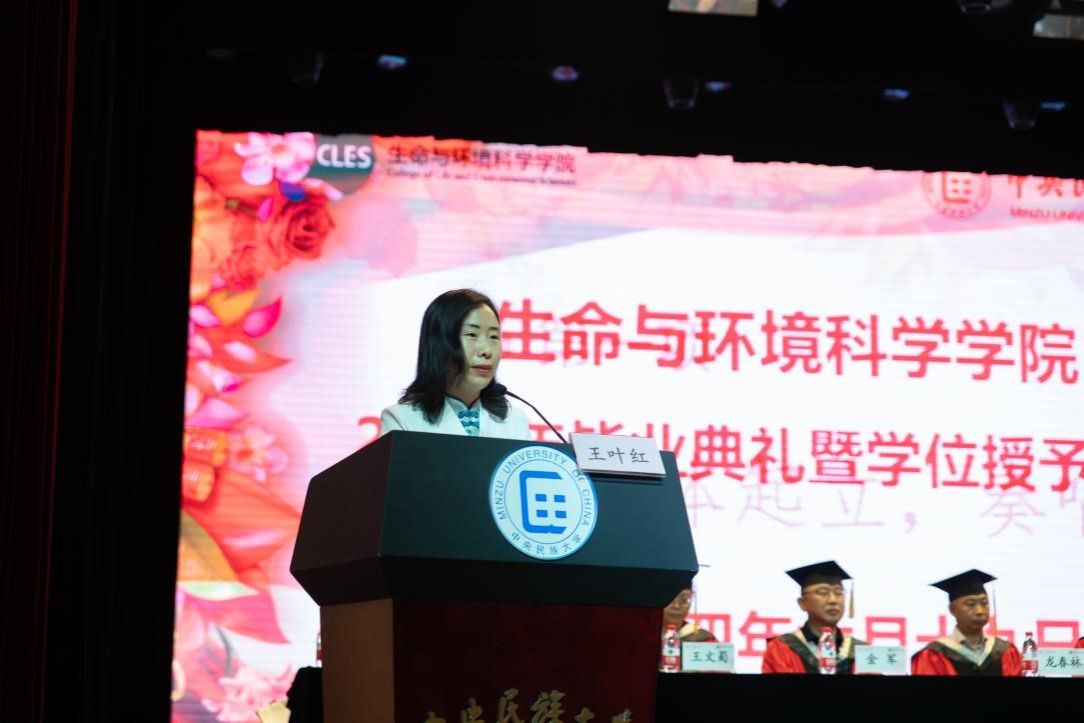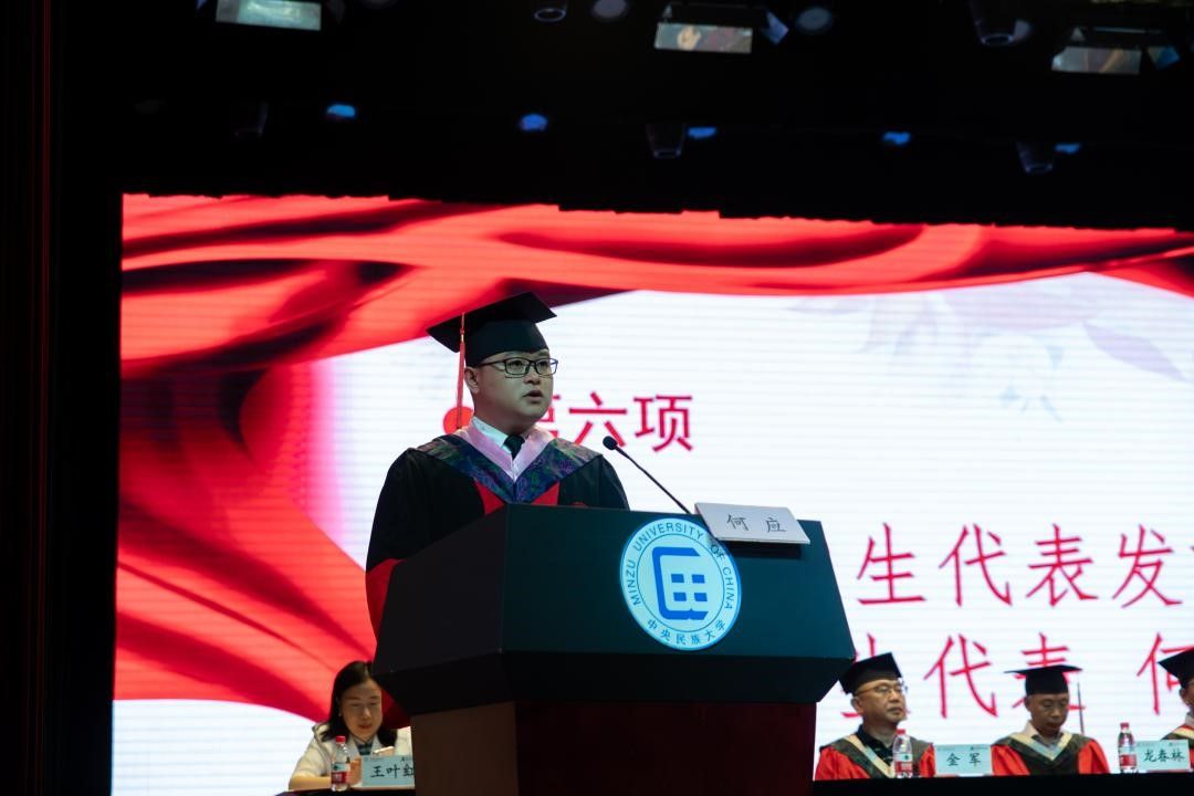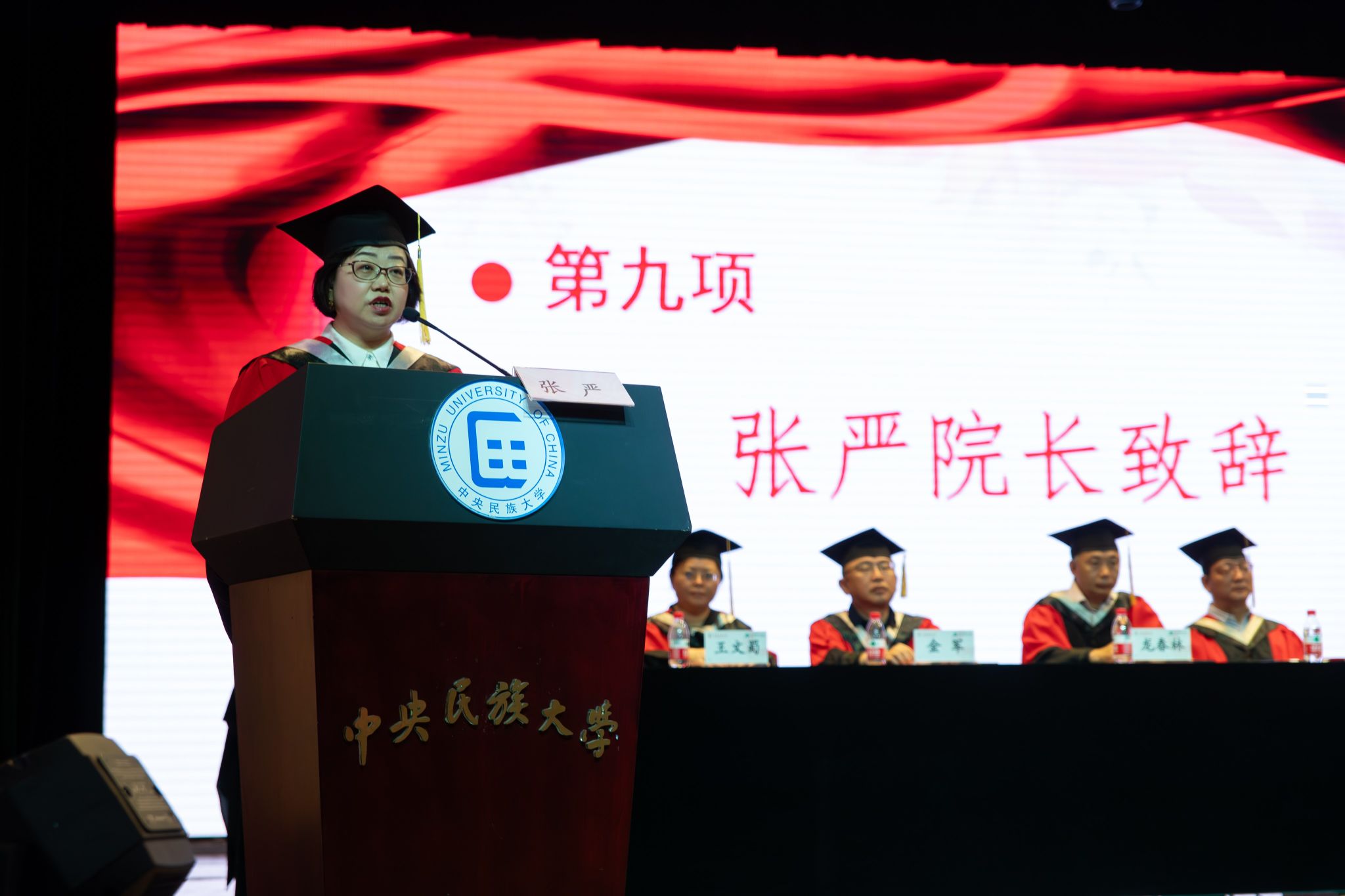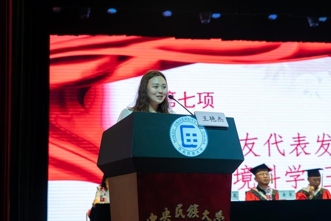 2005级校友代表王艳杰表达了对学校和学院培养之恩的感激。她表示,母校百年来沉淀的优良校风涵养一代又一代民大人的灵魂与气质,并鼓励毕业生们勇敢追求自己的梦想,牢记青年一代肩上的责任和使命,保持学习和成长的态度,面临困难和挫折也要保持前进并坚持不懈。