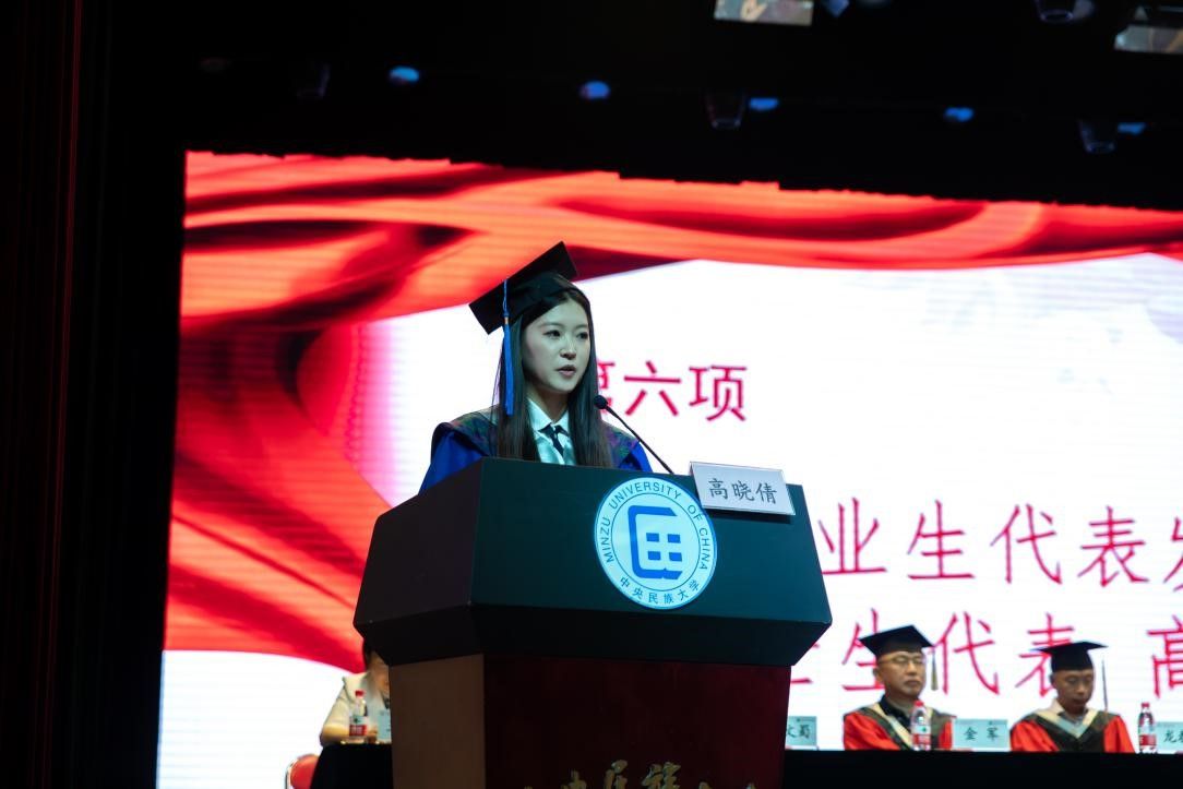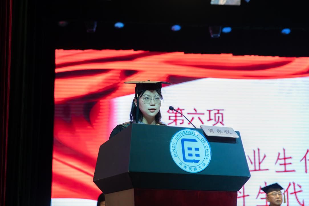 硕士毕业生代表高晓倩同学首先向全体老师的付出表达了真挚的感谢。回首三年学生时光,她表示,与民大相遇是一段珍贵而又美好的缘分。同时也强调,同学们的未来发展要以小我融入大我,将蓬勃青春与祖国发展融入一起。最后她祝愿生环学院年年桃李,岁岁芬芳,祝福生环学子前程似锦。