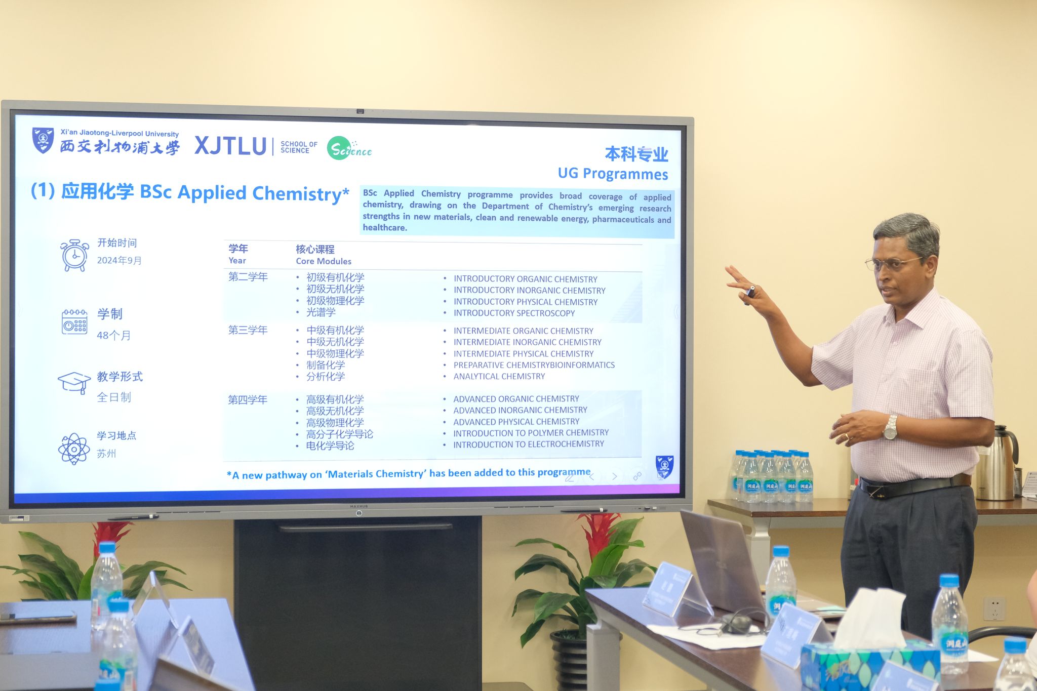 随后,西交利物浦大学理学院院长John Moraros教授介绍了西交利物浦大学理学院建设历史、师资队伍、学科概况,并分享了各个科研领域的突出成果。西交利物浦大学理学院学习与教学副院长Sekar Raju博士介绍了学院的教学模式、课程安排以及学位授予等教学体系,并详细介绍了学院的教学项目和特色。