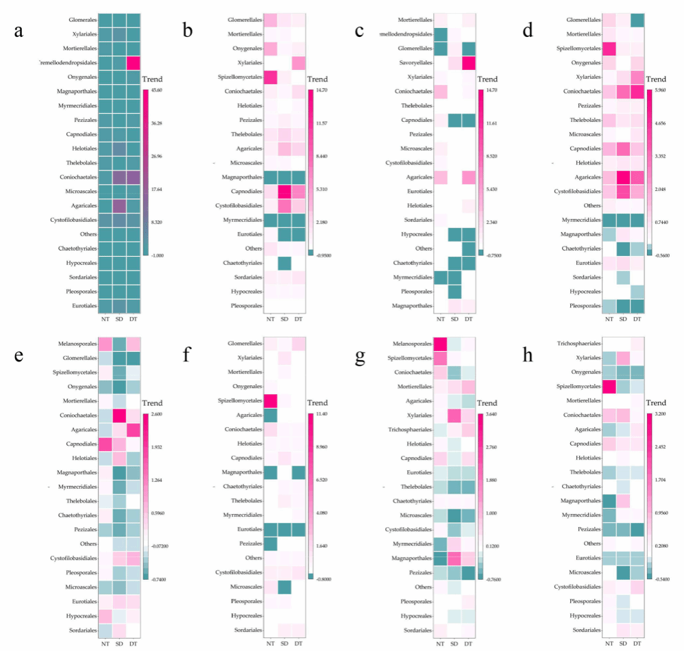 a–d分别展示了内生细菌相对丰度的变化情况。a为拔节阶段,b为开花阶段,c为成熟阶段,d为所有阶段。e–h分别表示根际真菌相对丰度的变化情况。e为拔节阶段,f为开花阶段,g为成熟阶段,h为所有阶段。前20个真菌目按相对丰度排序。CT:传统;NT:免耕;SD:错位轮还;DT:深耕