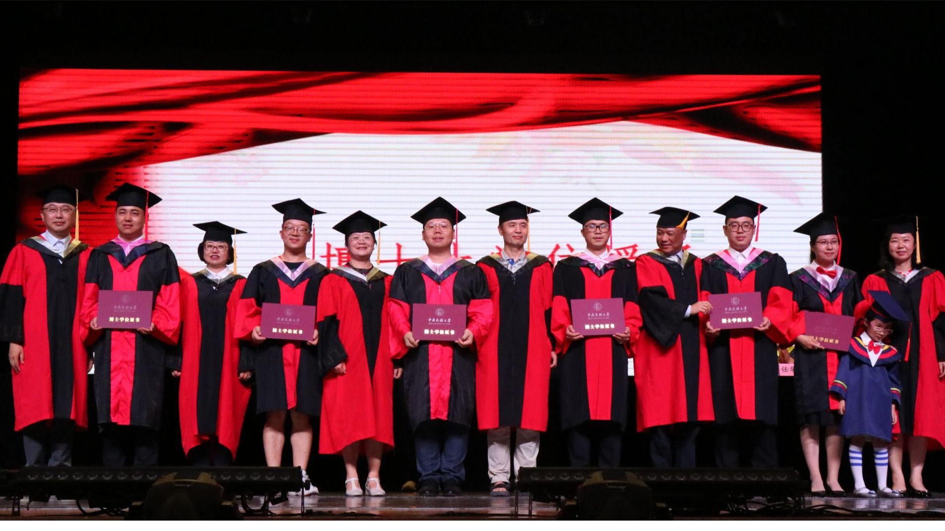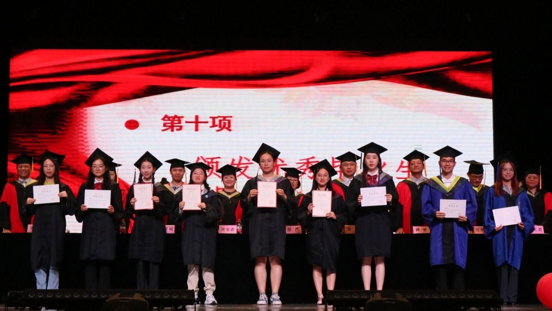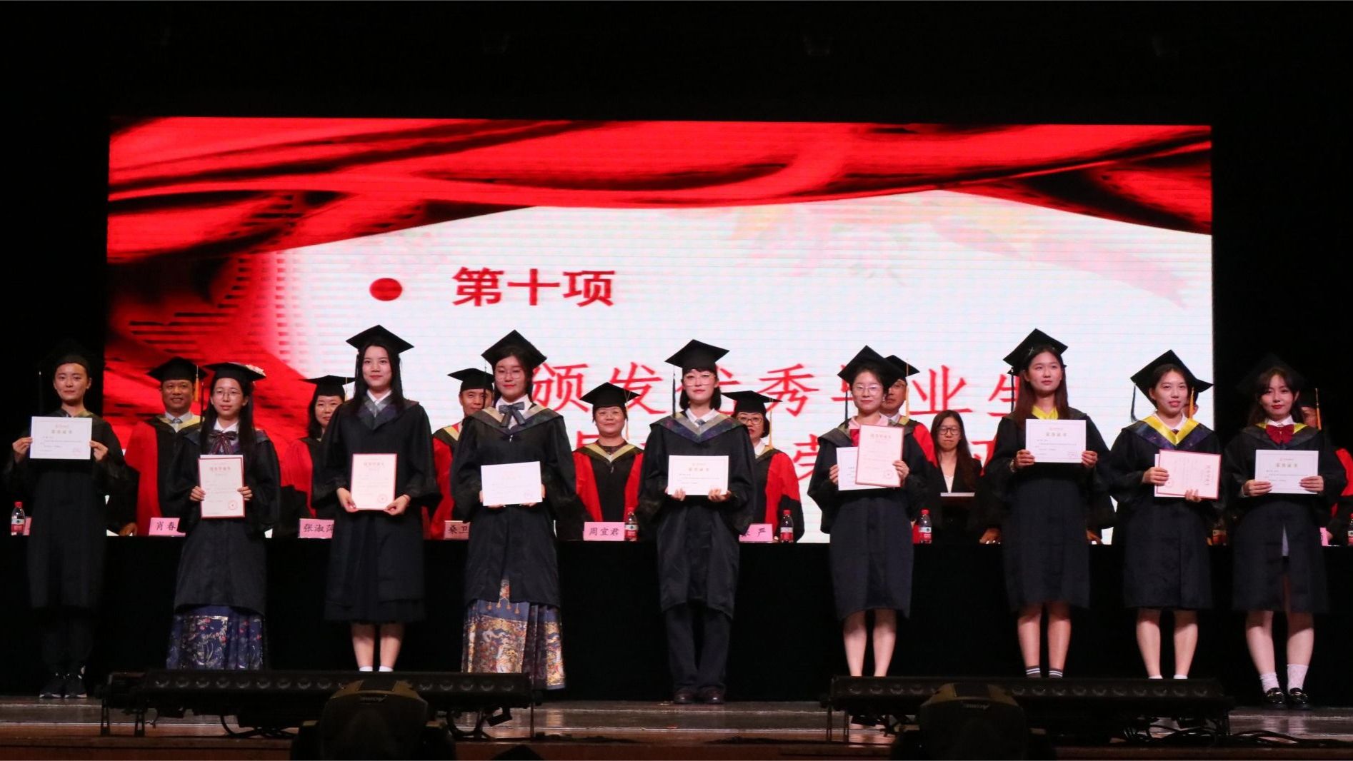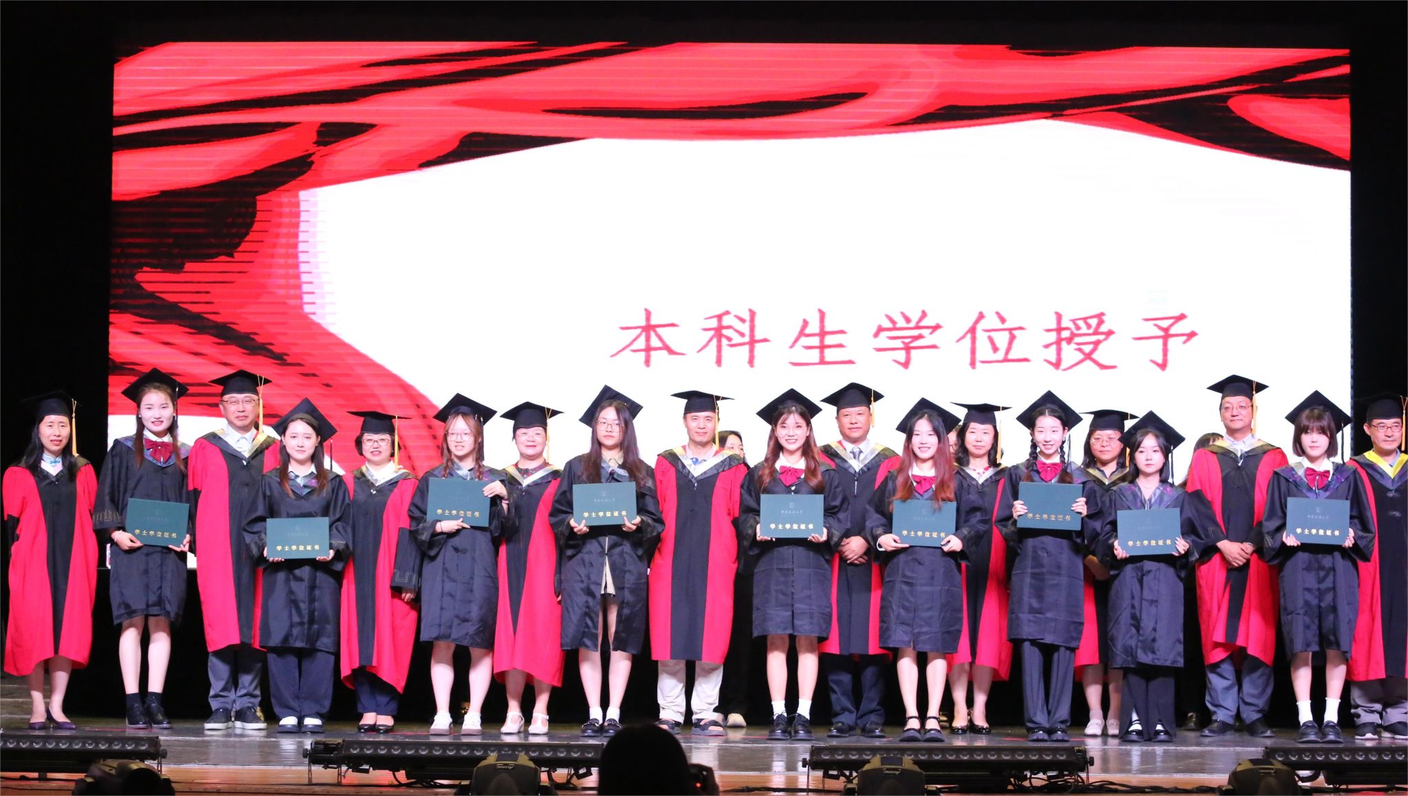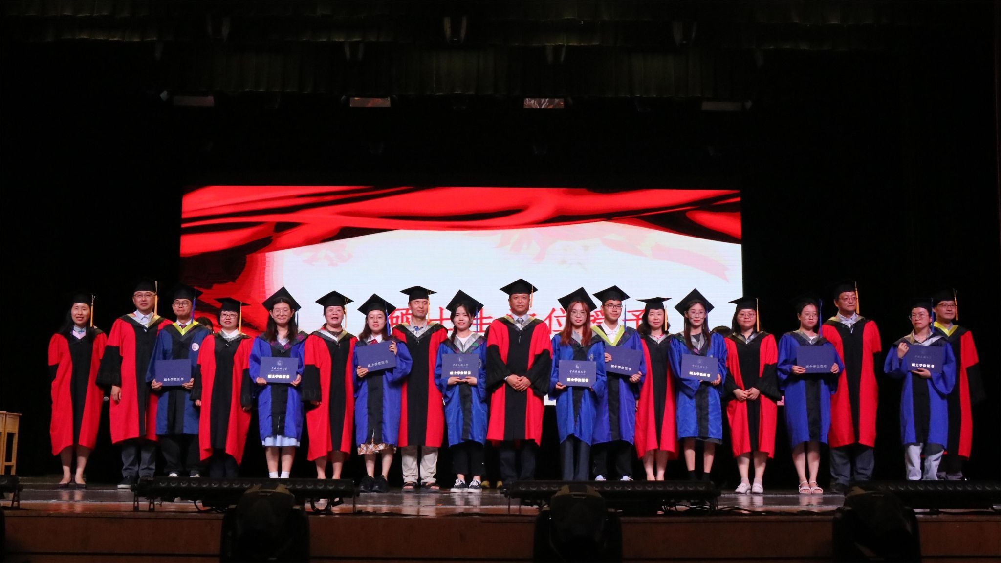 典礼最后,出席会议的全体老师为毕业生颁发荣誉证书、拨穗正冠、授予学位证书并合影留念。