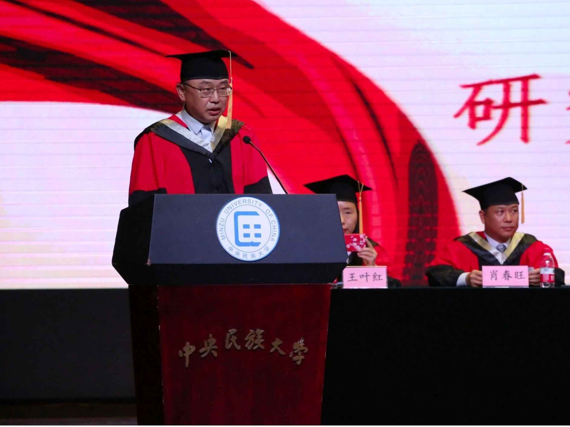 学校第二届优秀研究生导师肖春旺教授代表教师致辞,首先祝贺各位同学圆满完成学业,并表示在同学们身上时时刻刻感受着敢想敢为的热情和不屈不挠的斗志,体会到了教学相长的快乐,希望同学们从民大出发不惧风雨,勇敢向前!
