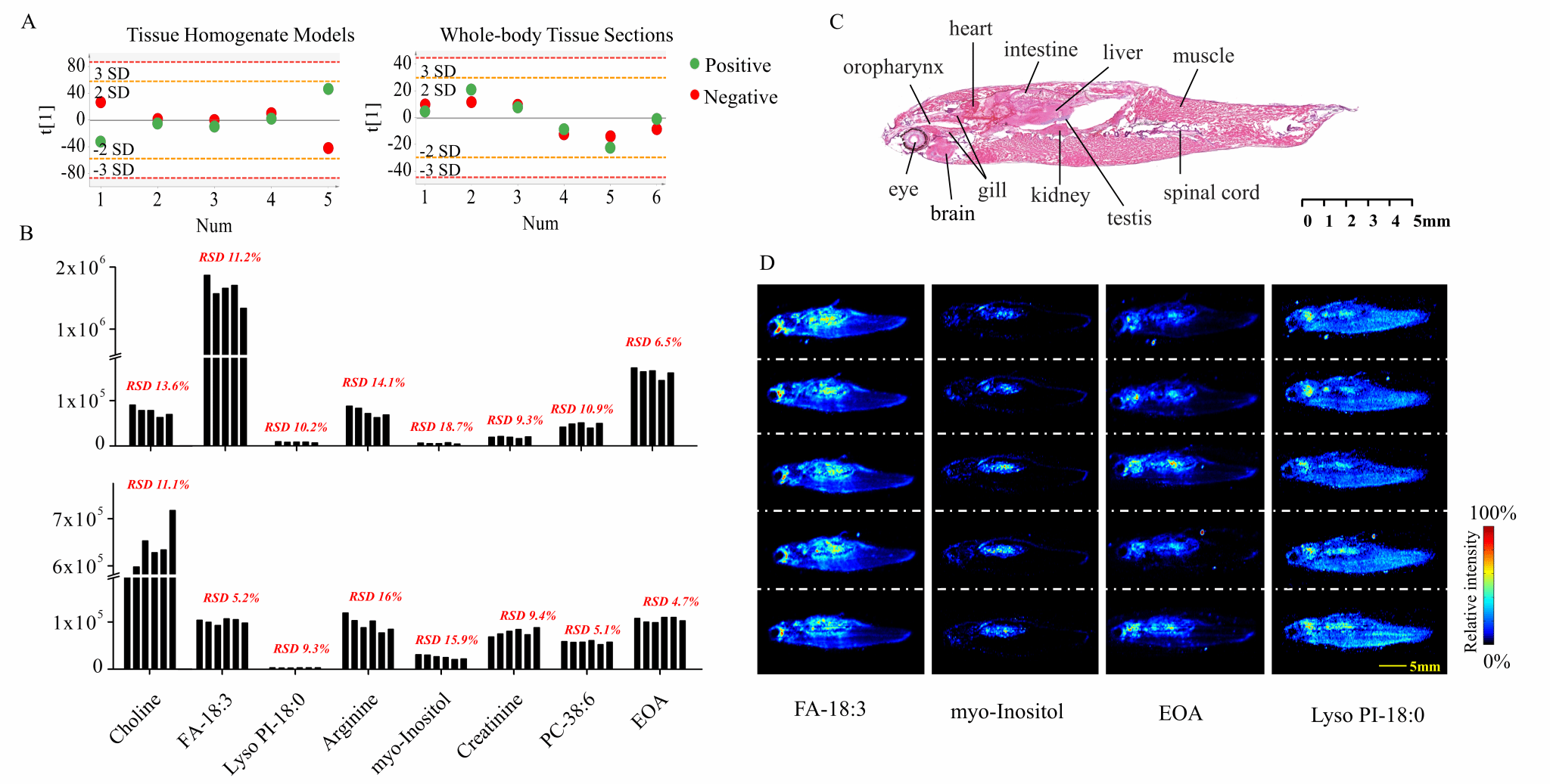 斑马鱼是研究人类疾病的优良材料,尤其在精准肿瘤学动物模型构建领域具有独特优势与前景。由于人类肿瘤多发生于成人期,大多数已报道的基于斑马鱼模型的肿瘤研究采用胚胎或幼鱼,无法真实模拟肿瘤的体内启动过程。本研究采用新型敞开式质谱成像技术AFADESI-MSI,通过系统优化关键参数,建立了适合于斑马鱼成鱼冰冻组织切片的空间分辨代谢组学分析新方法。该方法覆盖度良好、灵敏度高,可检测到1000余个不同的代谢物;通过提取眼、脑、鳃、心、肝、肾、肠、肌肉、脊髓等9个器官区域的质谱成像数据,获得了不同器官特征代谢组及其特异性代谢物。在此基础上,构建了包含代谢物原位信息的斑马鱼全局代谢网络。本研究在代谢水平上提供了斑马鱼成鱼全面而直观的分子信息,为基于斑马鱼模型的疾病代谢重编程研究提供了新的技术手段。