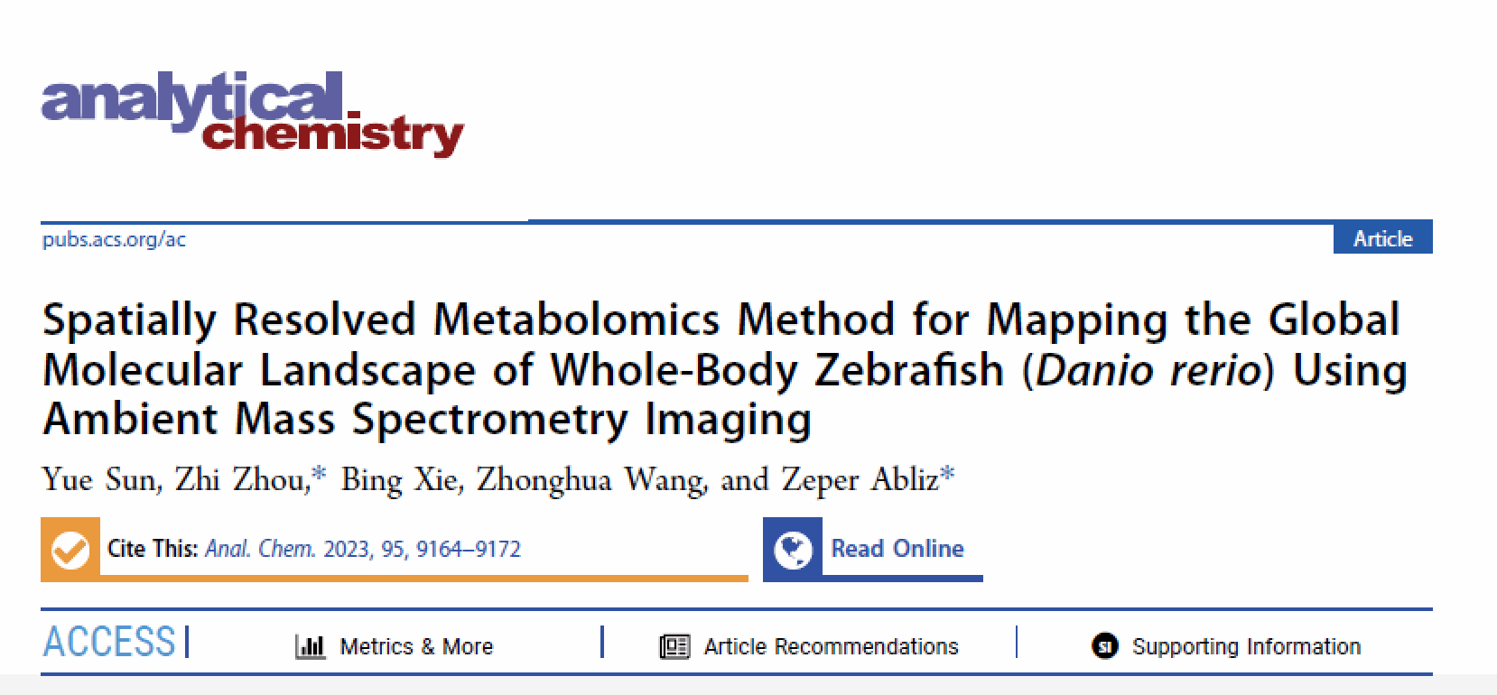 Molecular Landscape of Whole-Body Zebrafish (Danio rerio) Using Ambient Mass Spectrometry Imaging”为题于2023年6月2日在Analytical Chemistry(化学1区Top)期刊以封面论文发表,论文链接://doi.org/10.1021/acs.analchem.2c05047。