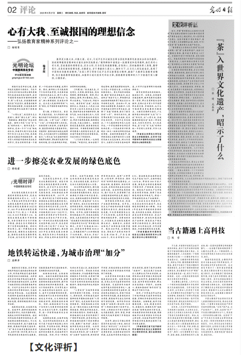 /民族地区生态环境国家民族重点实验室主任龙春林教授和生态学硕士生张晴同学,基于实验室前期关于景迈山古茶园的民族生态学研究成果,撰写了“‘茶’入世界文化遗产,昭示了什么”一文,于9月27日在《光明日报》“文化评析”版块发表。