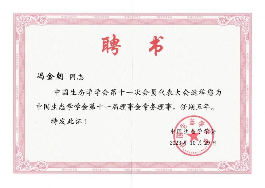 中国生态学学会同时召开了第十一次会员代表大会,选举产生第十一届理事会理事和第二届监事会监事。冯金朝教授当选为中国生态学学会第十一届理事会常务理事。