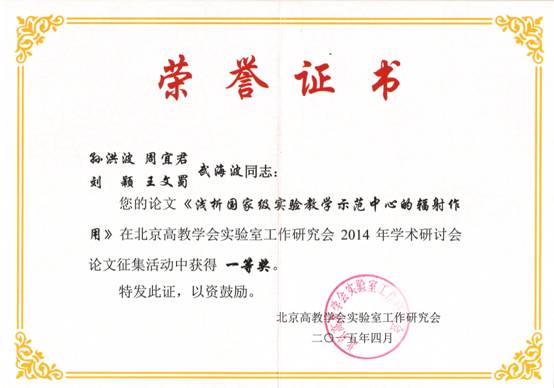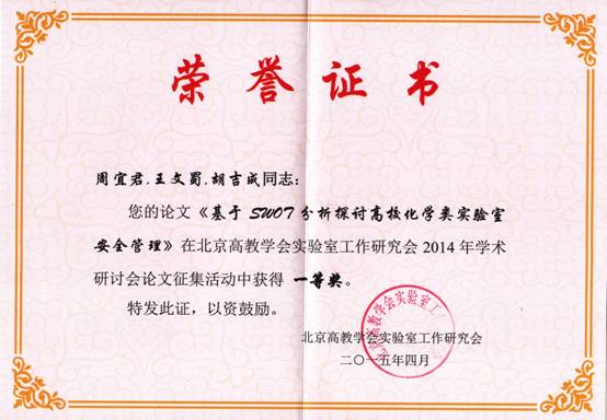 周宜君教授等撰写的《基于SWOT分析探讨高校化学类实验室安全管理》和孙洪波副教授等撰写的《浅析国家级实验教学示范中心的辐射作用》2篇论文荣获一等奖。