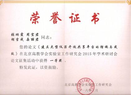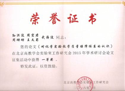 2016年4月1日,北京市高教实验室工作研究会第六届理事会第四次全体理事大会暨2015年学术年会在北京化工大学会议中心召开,会议对2015年度北京市高校实验室工作研究会所征集评选的优秀论文进行表彰,其中10篇论文获得一等奖。飞禽走兽