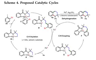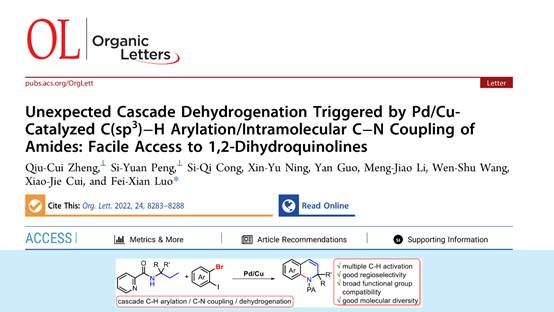 罗斐贤研究组利用前期发展的碳氢键活化启动的串联反应策略(Org. Lett. 2019, 21, 1668.),探索Pd/Cu协同催化生物质醇小分子衍生制备的酰胺合成高价值四氢喹啉化合物,意外发现了串联中性碳氢键脱氢反应得到具有重要应用价值的1,2−二氢喹啉分子骨架。通过机理研究证实,该反应首先经历Pd催化分子间碳氢键芳基化反应,接下来Cu催化串联分子内碳氮键偶联和后续Pd催化四氢喹啉β,γ−脱氢反应得到1,2−二氢喹啉化合物,实现了三步反应一锅法高效有序转化。此外,脱氢反应步骤中Ag2CO3和卤代烃都至关重要。该研究为烷烃脱氢制备高价值烯烃提供了一种全新策略,具有重要的理论价值和潜在应用价值。相关研究成果以Unexpected Cascade Dehydrogenation Triggered by Pd/Cu−Catalyzed C(sp3)−H Arylation/Intramolecular C−N Coupling of Amides: Facile Access to 1,2−Dihydroquinolines为题在《Organic Letters》(化学1区,有机化学TOP期刊,IF=6.072 (Nature Index收录),Org. Lett. 2022, 24, 8283.)上发表。//doi.org/10.1021/acs.orglett.2c03203