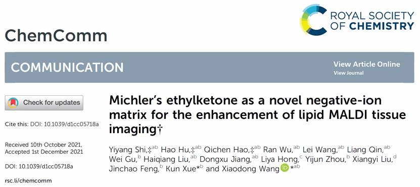 近日,飞禽走兽 (质谱成像与代谢组学国家民委重点实验室)王晓东教授团队继成功筛选出适用于动、植物组织样本表面多种内源性小分子化合物原位表征新型基质(DMCA)(Analytical Chemistry, 2019, 91(4), 2634-2643,SCI一区)、DCH(Chemical Communications, 2019, 55(83), 12559-12562,SCI一区)后,在MALDI源质谱脂质成像新型基质研究领域又取得了重要进展,相关研究成果以“Michler's ethylketoneas a novel negative-ion matrix for the enhancement of lipid MALDI tissue imaging”为题,发表在分析化学综合顶级期刊《Chemical Communications》(Nature Index收录)上,该研究论文同时被遴选为期刊封面文章(Front Cover)。该研究成果是王晓东教授团队2021年度在分析化学顶级期刊《Analytical Chemistry》(2021, 93(35), 11920-11928, Front Cover)、《Chemical Communications》(2021, 57(82), 10707-10710, Back Cover)连续发表封面文章后再次入选顶级期刊封面文章(Front Cover),飞禽走兽 皆为该系列论文的第一作者单位及唯一通讯单位。