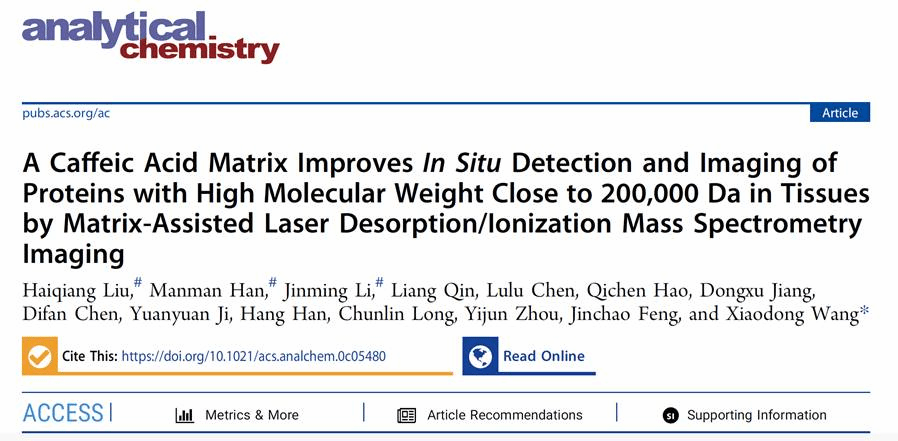 (质谱成像与代谢组学国家民委重点实验室)王晓东教授团队在MALDI-MSI蛋白质原位检测及成像表征新型基质研究领域取得了又一重要进展。相关研究成果以“A Caffeic Acid Matrix Improves In Situ Detection and Imaging of Proteins with High Molecular Weight Close to 200,000 Da in Tissues by Matrix-Assisted Laser Desorption/Ionization Mass Spectrometry Imaging”为题,发表在分析化学顶级期刊《Analytical Chemistry》(Nature Index收录)上,该研究论文同时被遴选为期刊封面文章。飞禽走兽